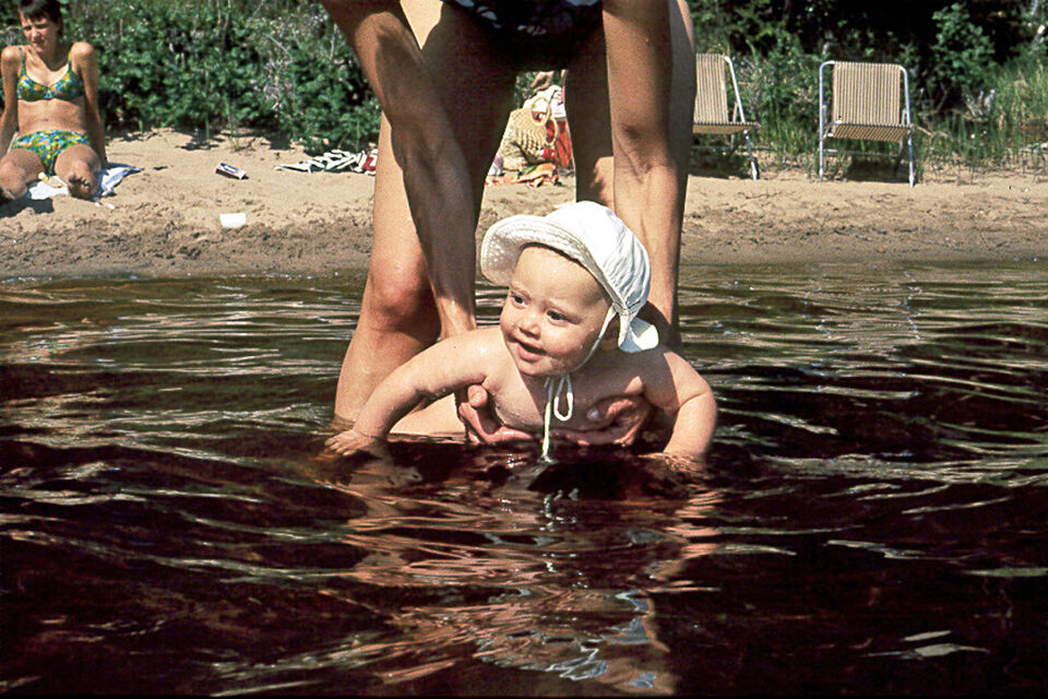 Susanne, Lisbeth och Peter är på badstranden vid Sånghussjön 1969