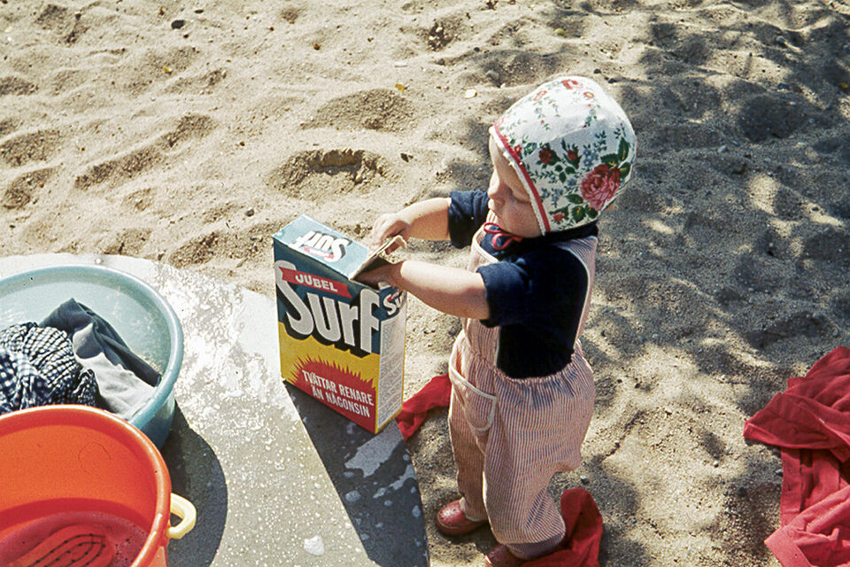 Susanne drygt ett år hjälper till med stortvätt på Lillåkern 1965